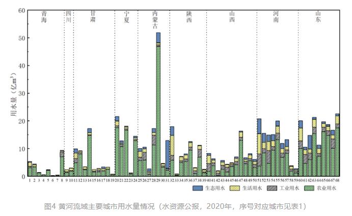 如图2和3所示,位于青海、四川、甘肃、宁夏和内蒙古等省(自治区)的黄河流域绝大多数主要城市,其主要供水水源为地表水。位于河南和山东省的城市大部分依赖于地下水供水。郑州、西安、济宁、济南和太原等城市其他水源亦占供水总量的较大比例。