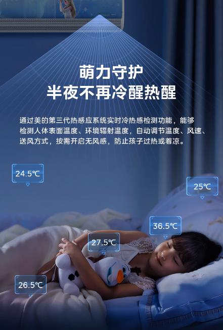 为了带给宝妈和孩子舒适体验,美的儿童空调和萌愈空调系列,针对宝宝温度敏感体质,定制层递式柔软送风技术,可柔化气流,减少硬风直吹造成的着凉。同时创新的无风感技术,能让空调出风更柔、体感更舒适,让宝妈和宝宝几乎感觉不到风,带来无风感、有凉感的舒适体验。此外,美的儿童空调和萌愈空调系列还搭载了美的第三代热感应系统,能够实时检测人体表面温度、环境辐射温度,自动调节温度、风速及送风方式,按需开启无风感,防止宝宝过热或者着凉,萌力守护,让宝宝半夜不再冷醒热醒,安心进入梦乡。